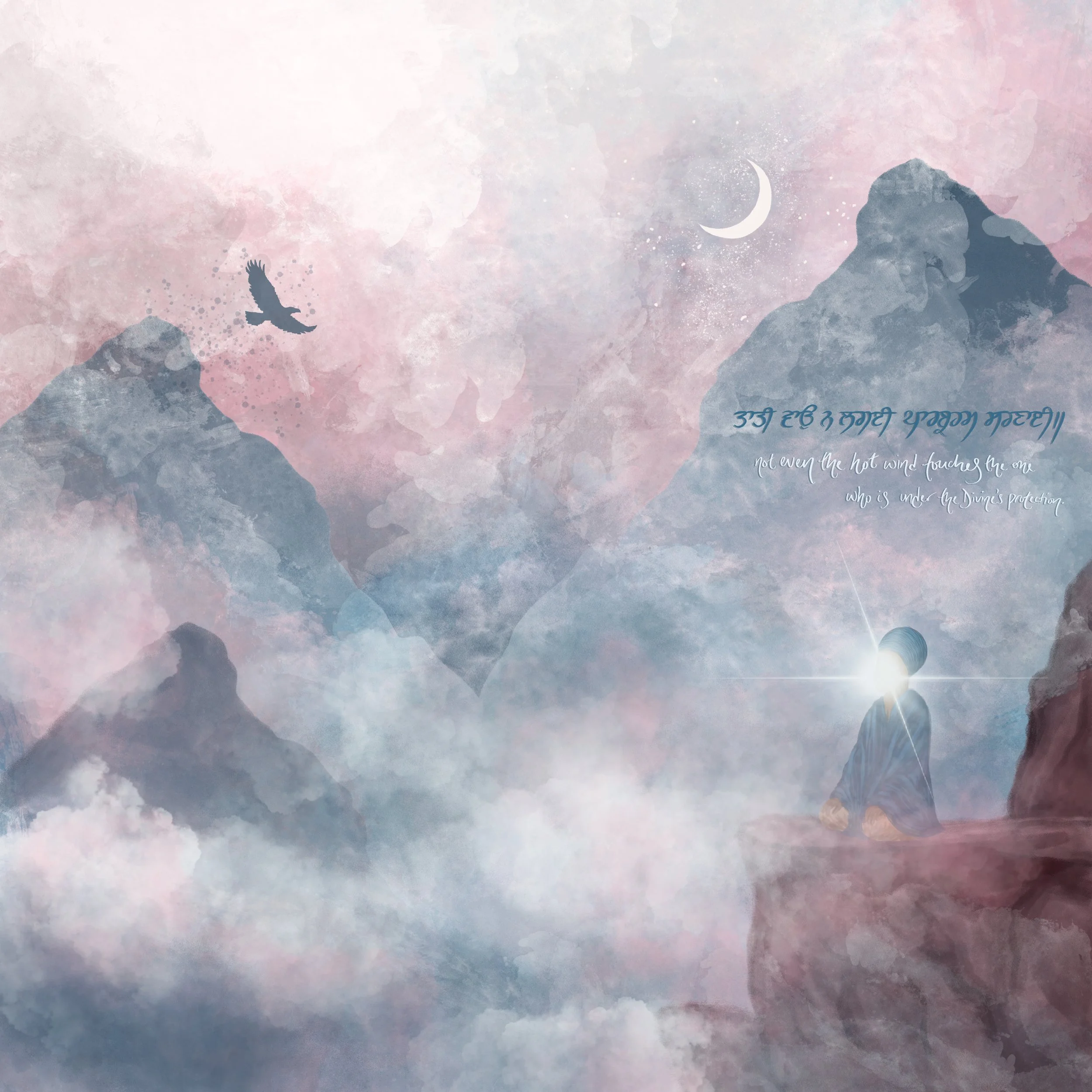 this piece is a part of the gurbani solace series, a series born out of community and hope. during the uncertainty and hurt of 2020, community from all over the world shared ਸ਼ਬਦ (shabads) and lines of ਗੁਰਬਾਣੀ (gurbani) that gave them hope in the face of helplessness. pieces part of this series are illustrations of these shabads that sangat holds so close to them, with the hope that we find even brief moments of solace in ਗੁਰੂ ਦੇ ਸ਼ਬਦ (the guru's shabad) when beholding these works.
