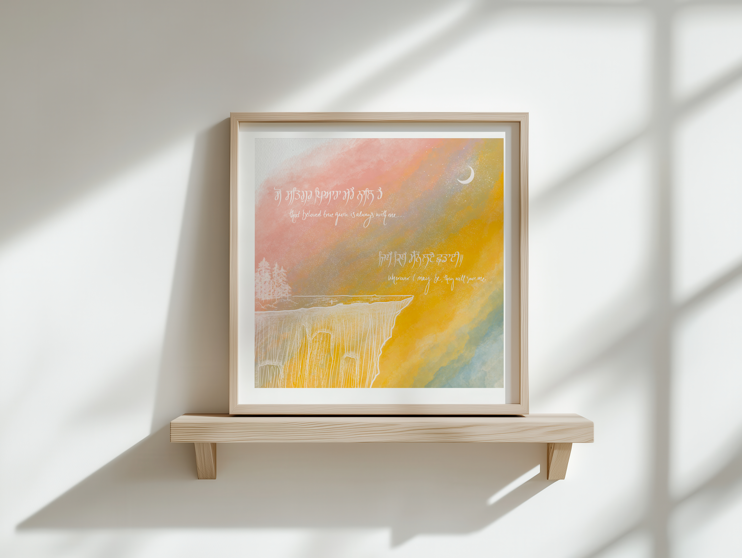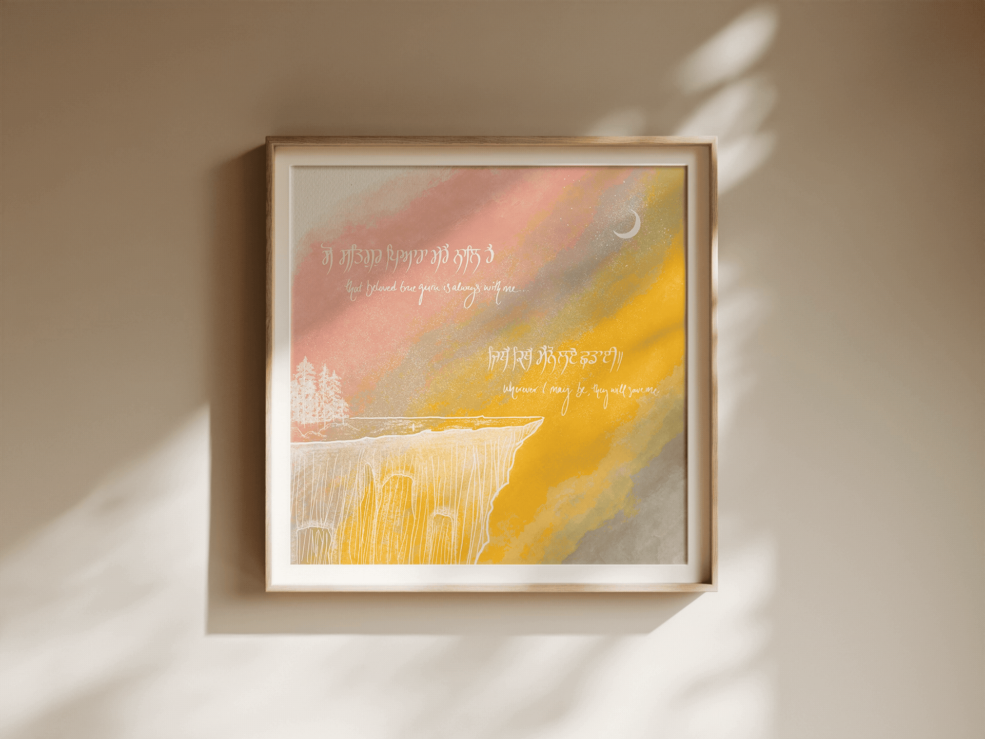 this piece is a part of the gurbani solace series, a series born out of community and hope. during the uncertainty and hurt of 2020, community from all over the world shared ਸ਼ਬਦ (shabads) and lines of ਗੁਰਬਾਣੀ (gurbani) that gave them hope in the face of helplessness. pieces part of this series are illustrations of these shabads that sangat holds so close to them, with the hope that we find even brief moments of solace in ਗੁਰੂ ਦੇ ਸ਼ਬਦ (the guru's shabad) when beholding these works.